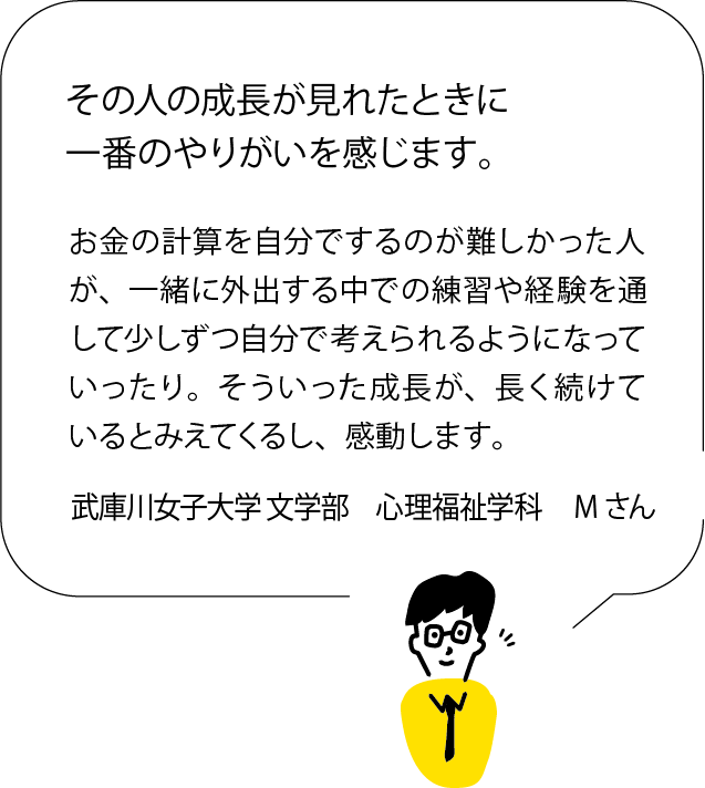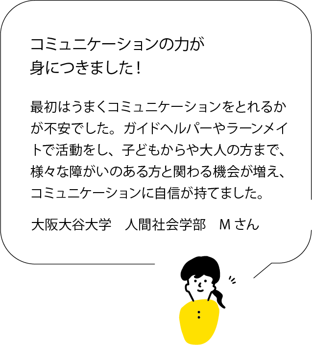 知的・精神障がい児者の外出するための支援について、講義や参加型ワークを通して学びます。実際に活動している学生のガイドヘルパーから活動について話が聞ける機会もあります。 資格取得には、座学2日と実習2日の全日課程(計4日)の参加が必要です。実習については大阪府内及び近隣府県を予定しています。